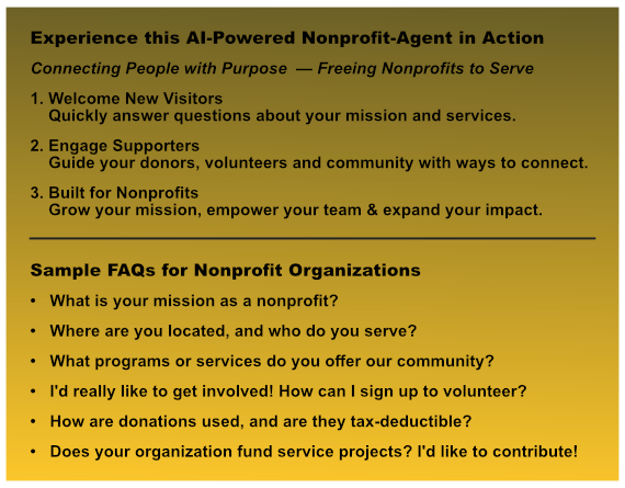 Want this AI-Powered Nonprofit-Agent on your website?Subscribe to the AI Agent package that best serves your mission,